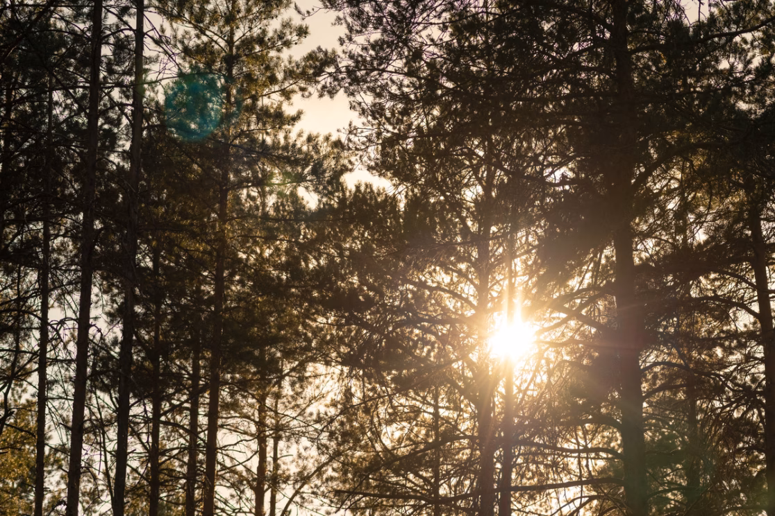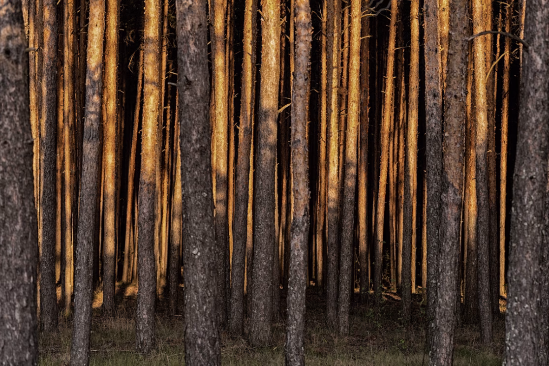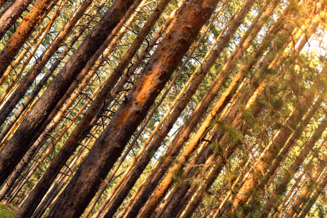 A cozy pine forest on the outskirts of Nizhny Novgorod, near the village of Dubravny. The golden sunlight filtering through tall trunks at sunset creates a warm, peaceful atmosphere — a quiet retreat from the city bustle.