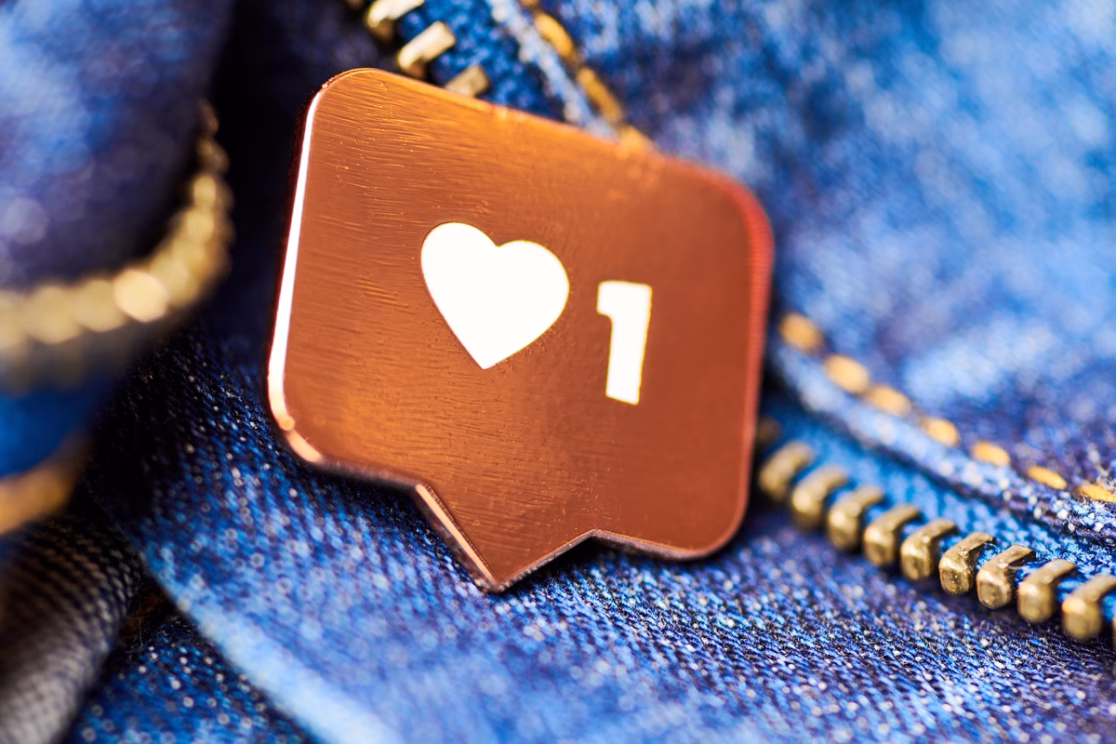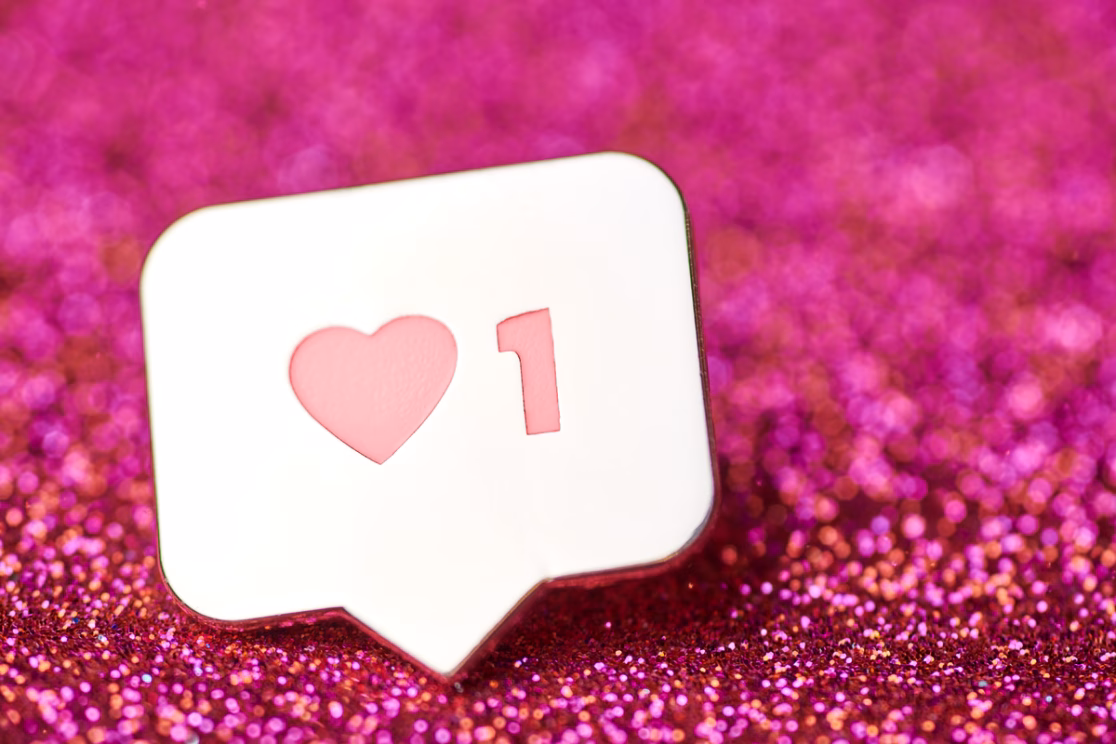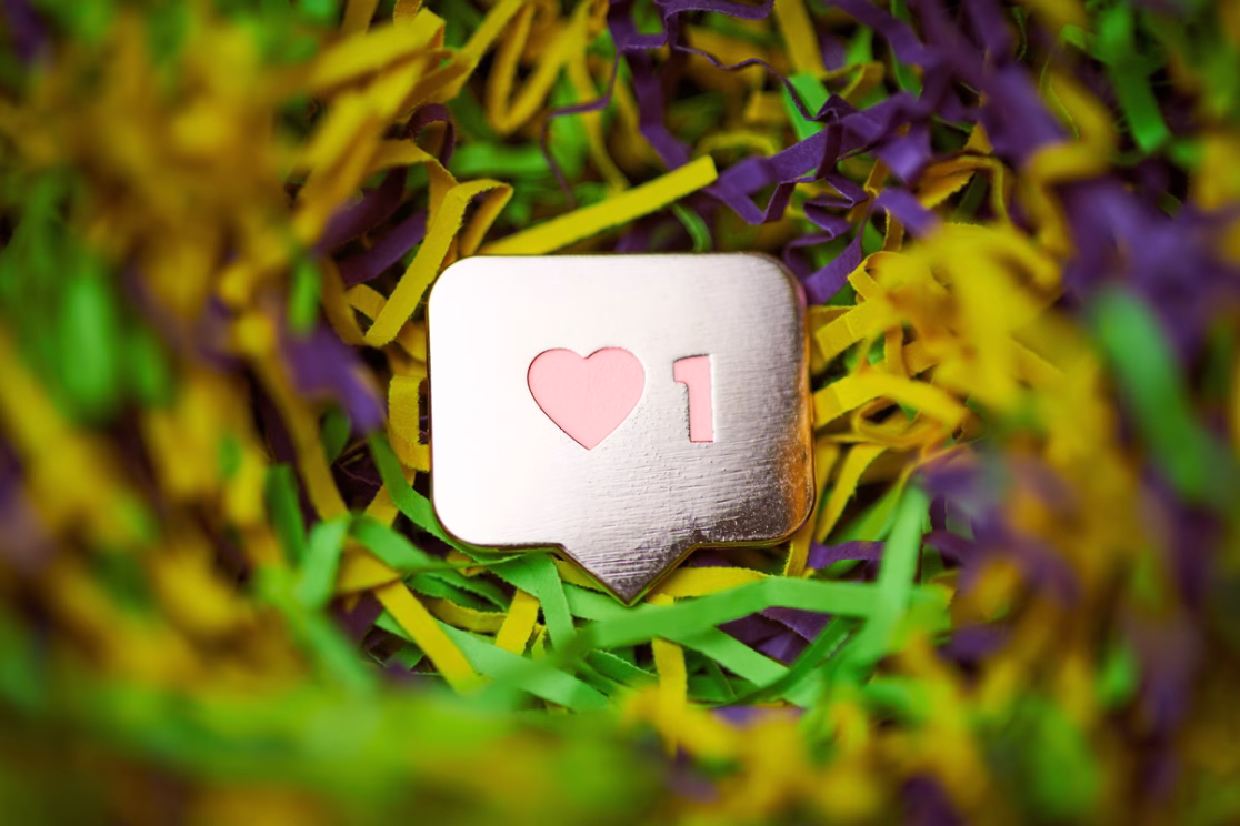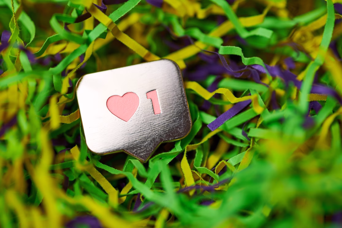 A close-up of a “like” symbol pin placed among vibrant decorations. This colorful and playful composition explores themes of social media, approval, and digital culture through a physical object staged with charm and irony.