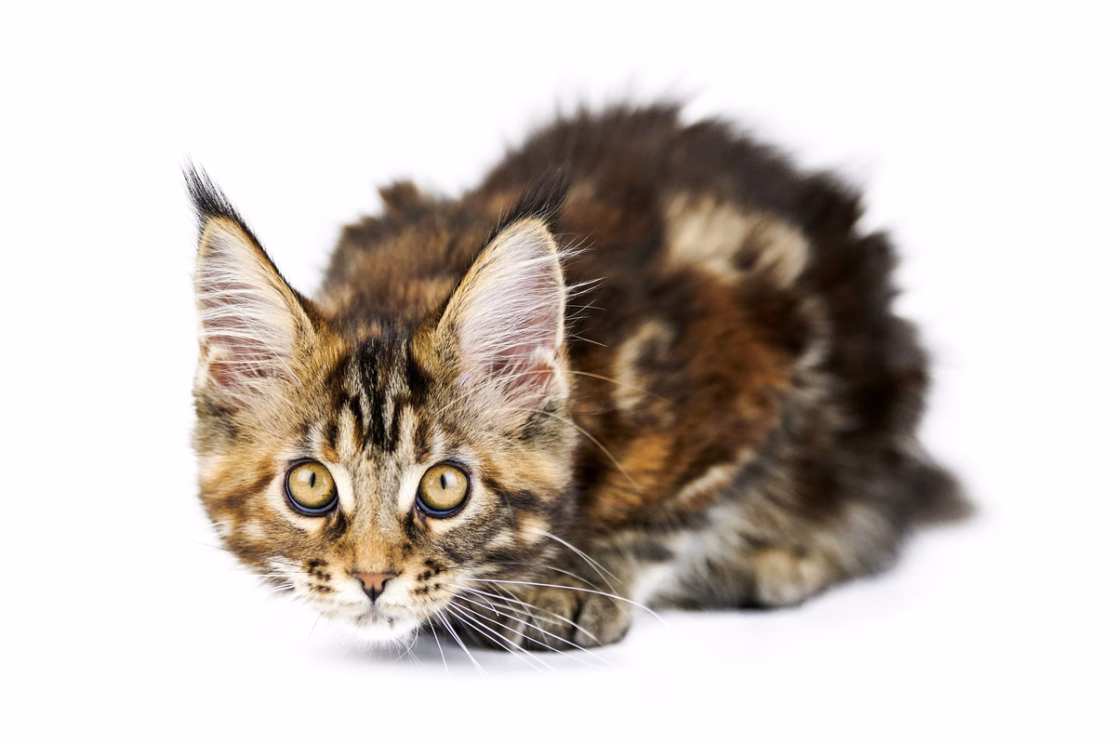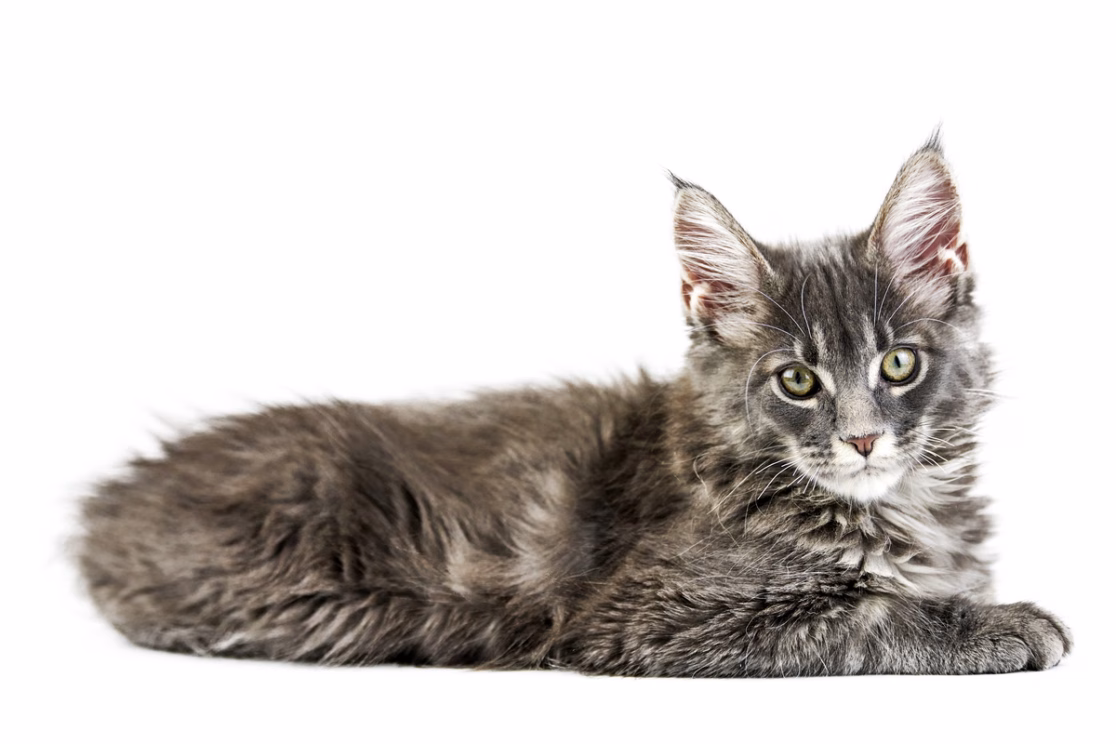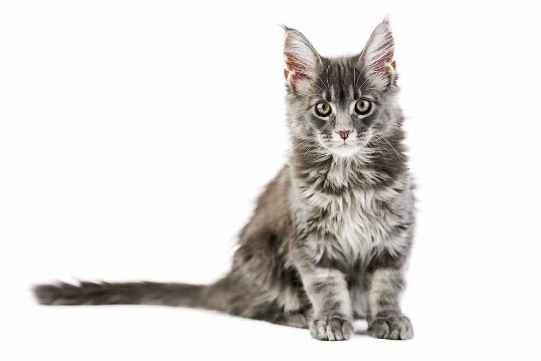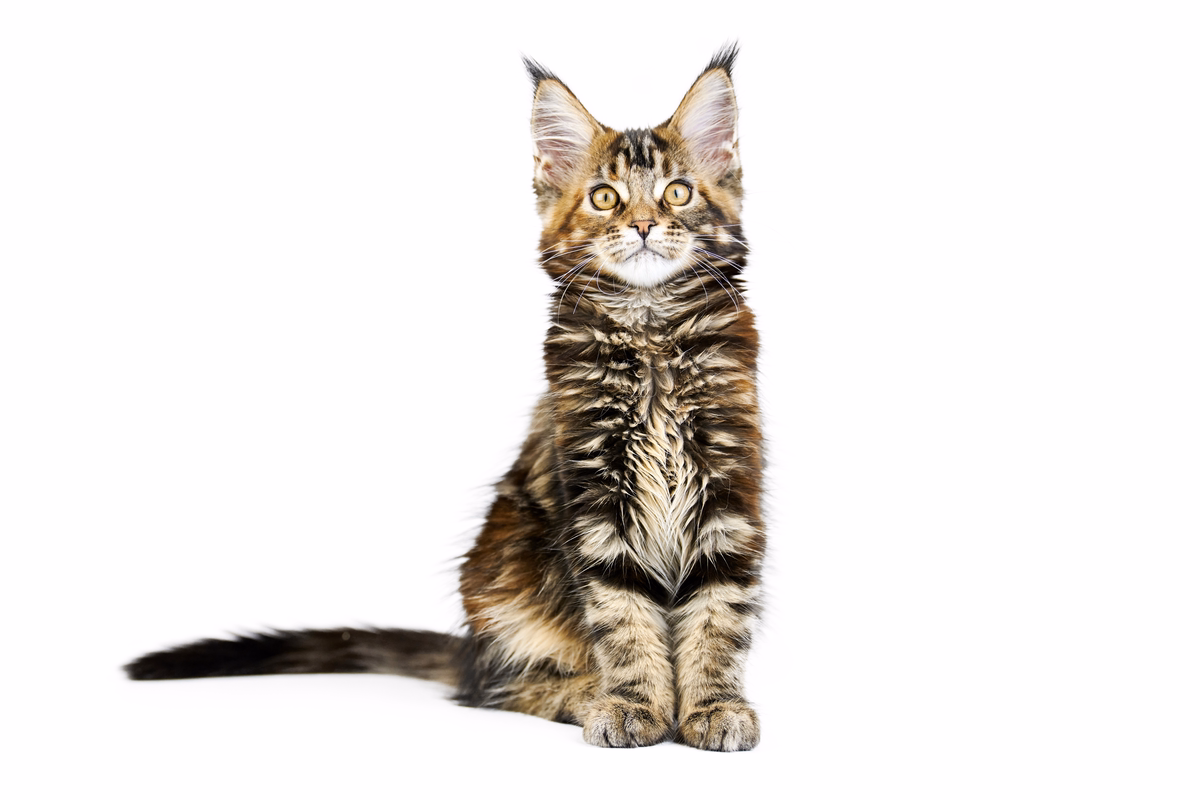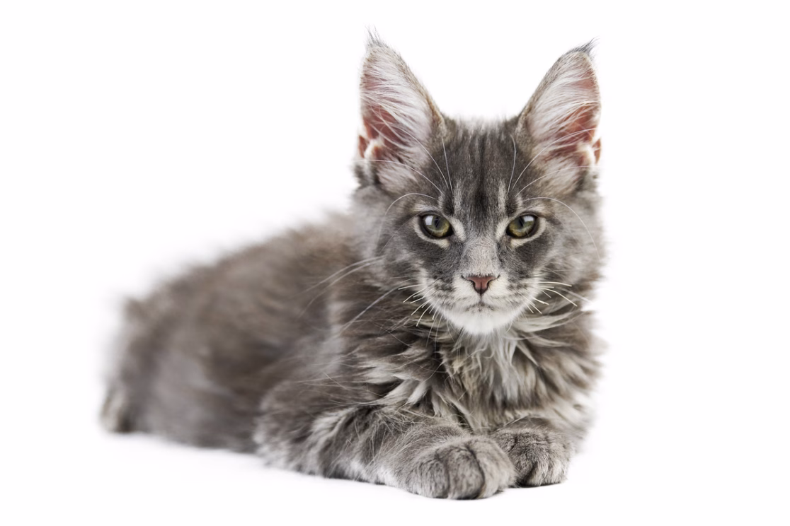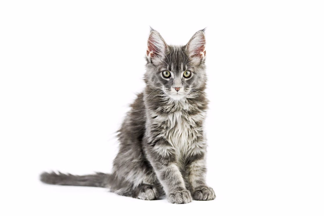 A series of striking photos featuring individual Maine Coon kittens against a clean white background. Each image highlights the unique charm and majestic fur of these gentle giants, focusing on their expressive eyes and fluffy coats in a minimalist setting.