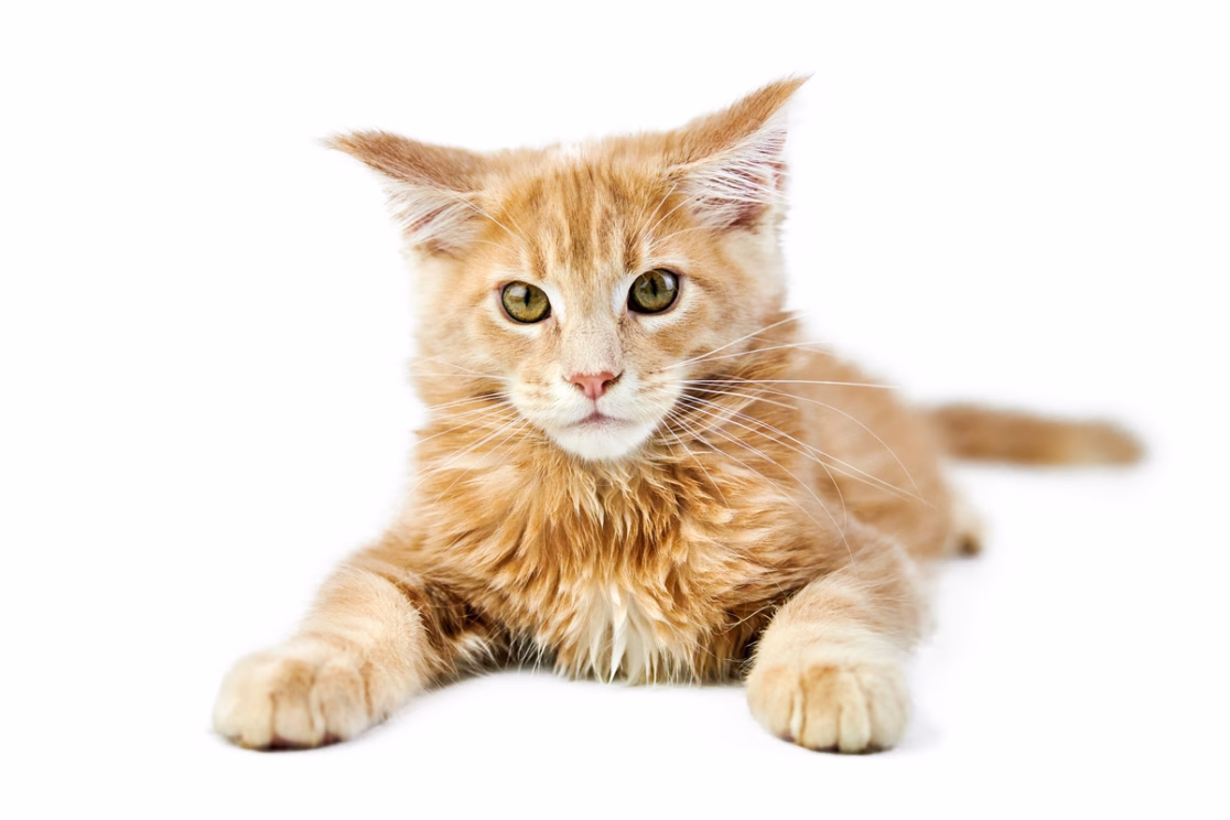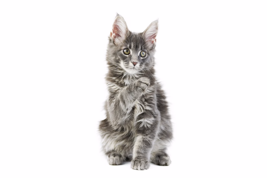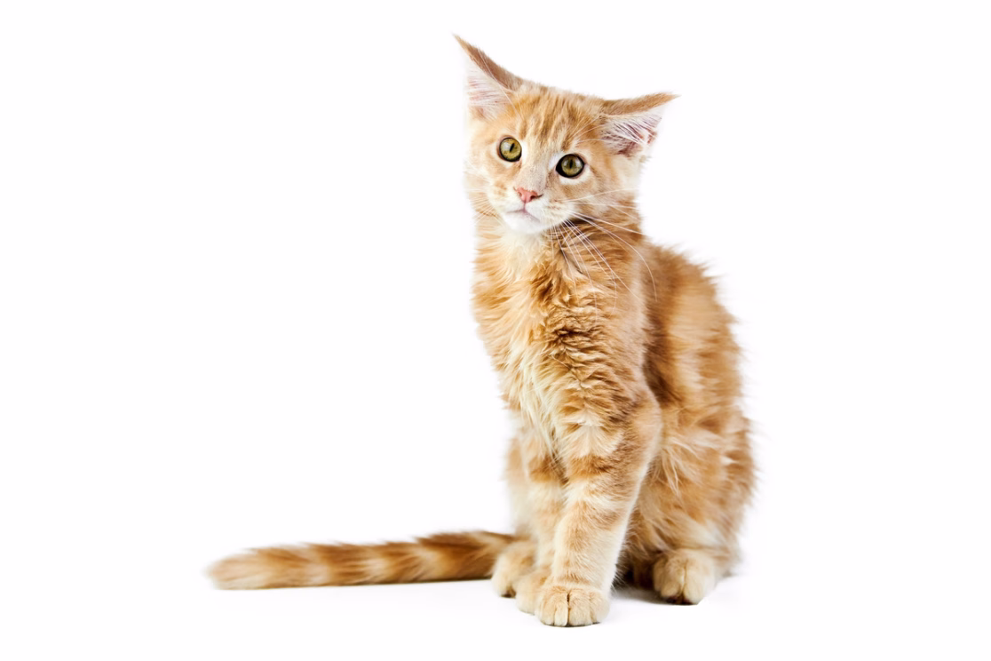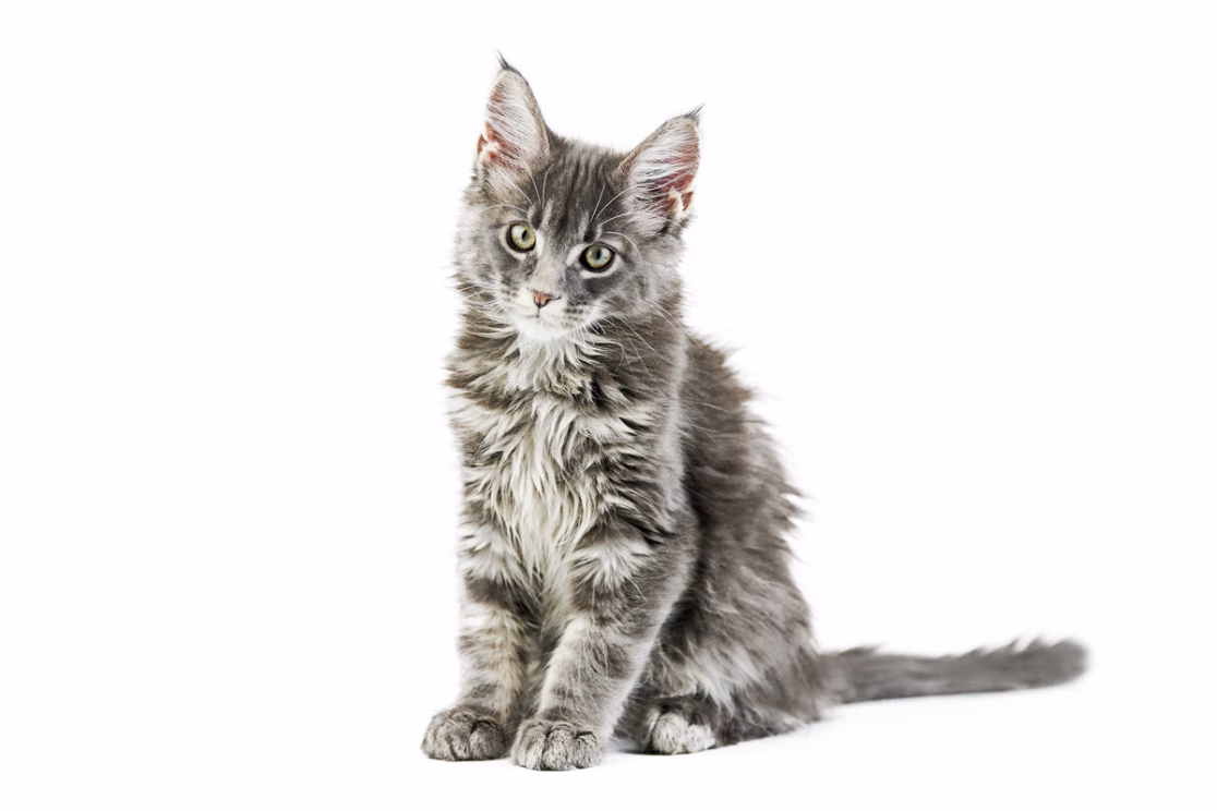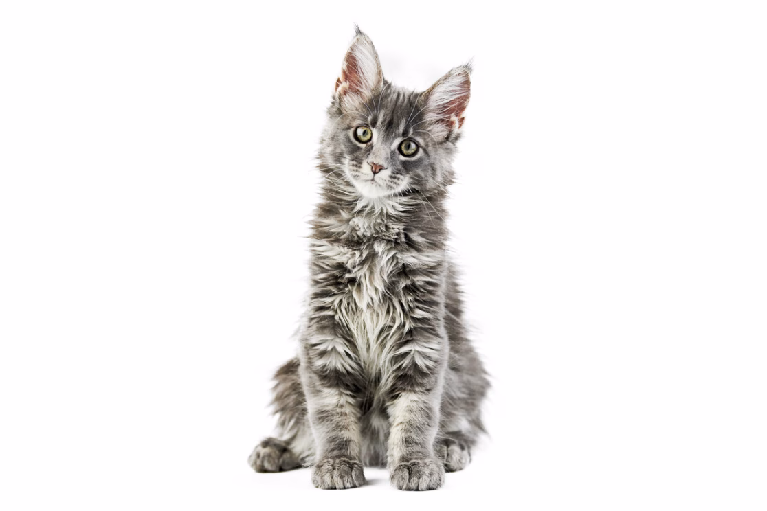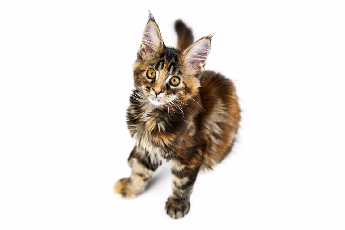 A series of striking photos featuring individual Maine Coon kittens against a clean white background. Each image highlights the unique charm and majestic fur of these gentle giants, focusing on their expressive eyes and fluffy coats in a minimalist setting.
