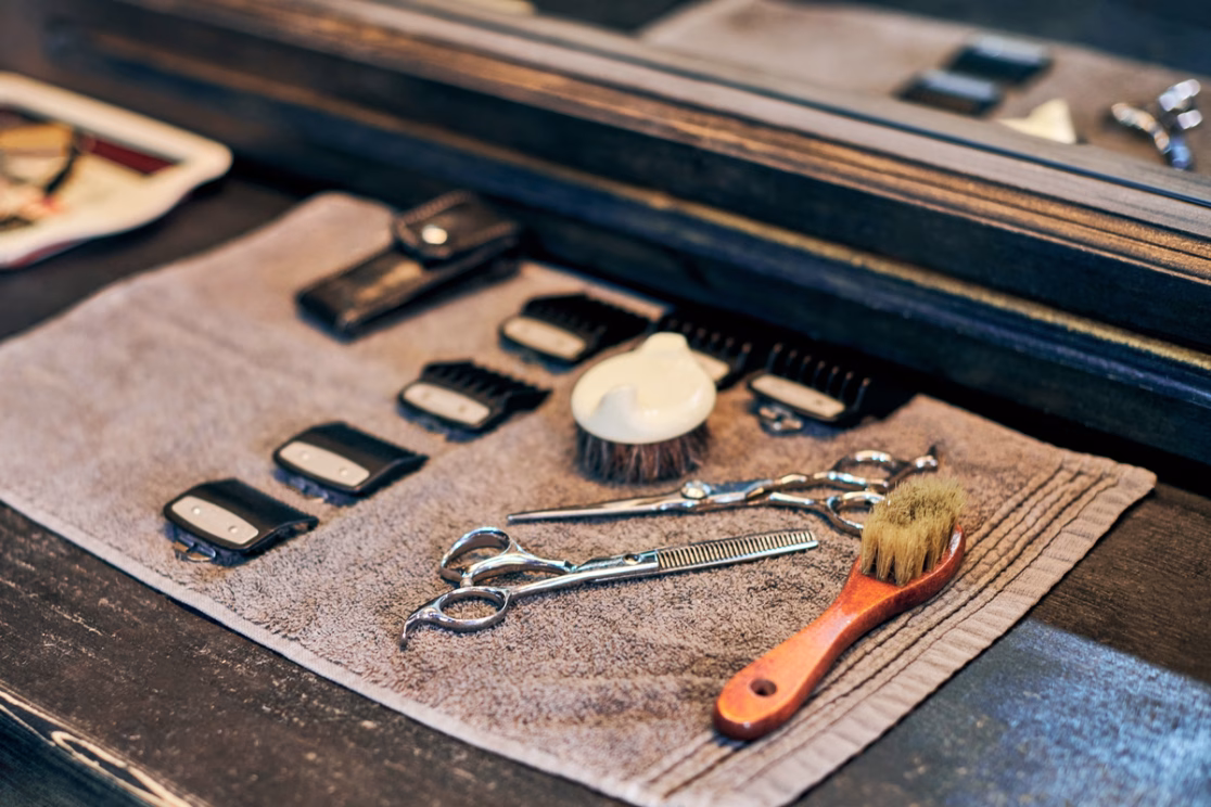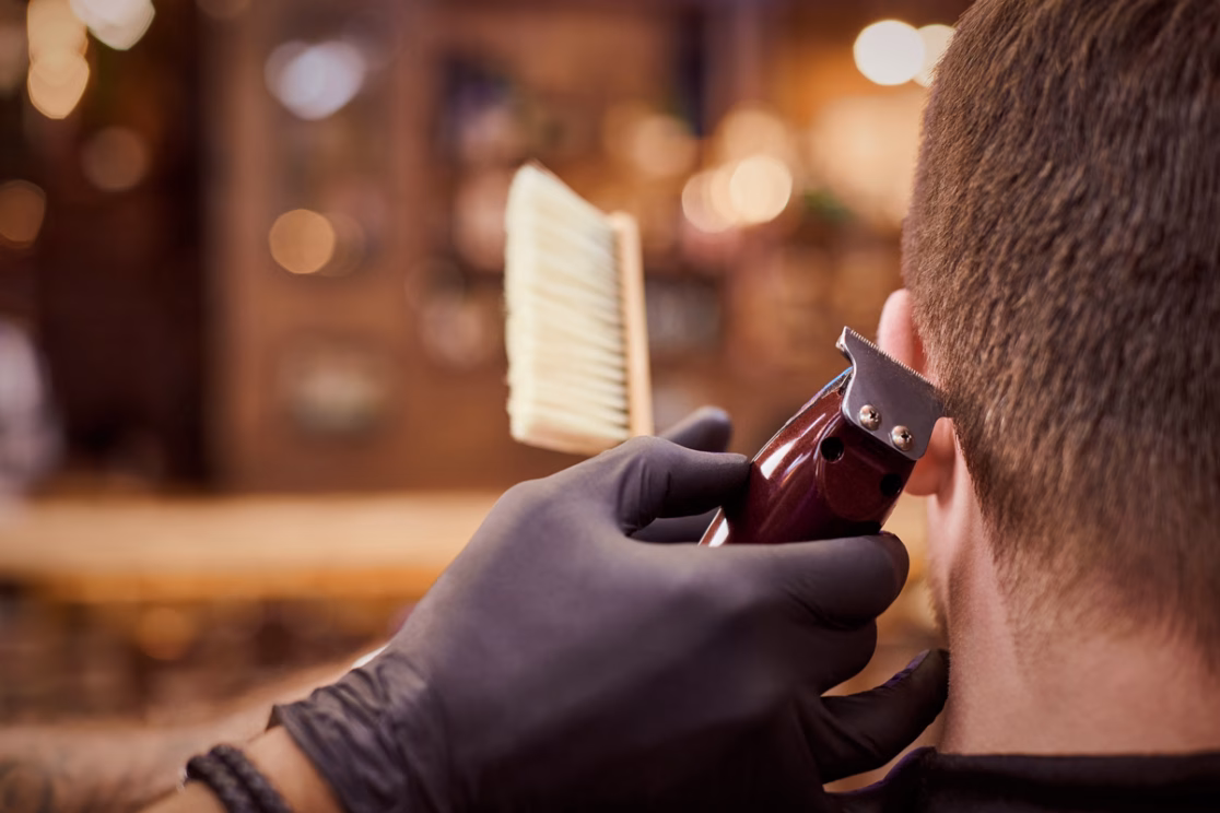 Close-up shots of a man getting a haircut in a high-end barbershop. The photos highlight the precision, luxury, and stylish atmosphere of the grooming experience. Elegant and refined, capturing the art of barbering.