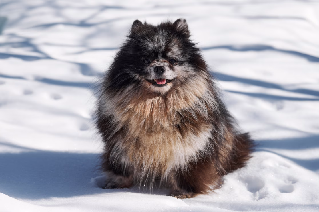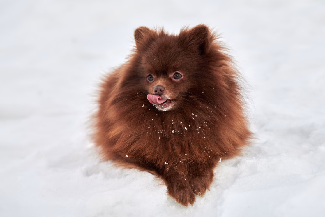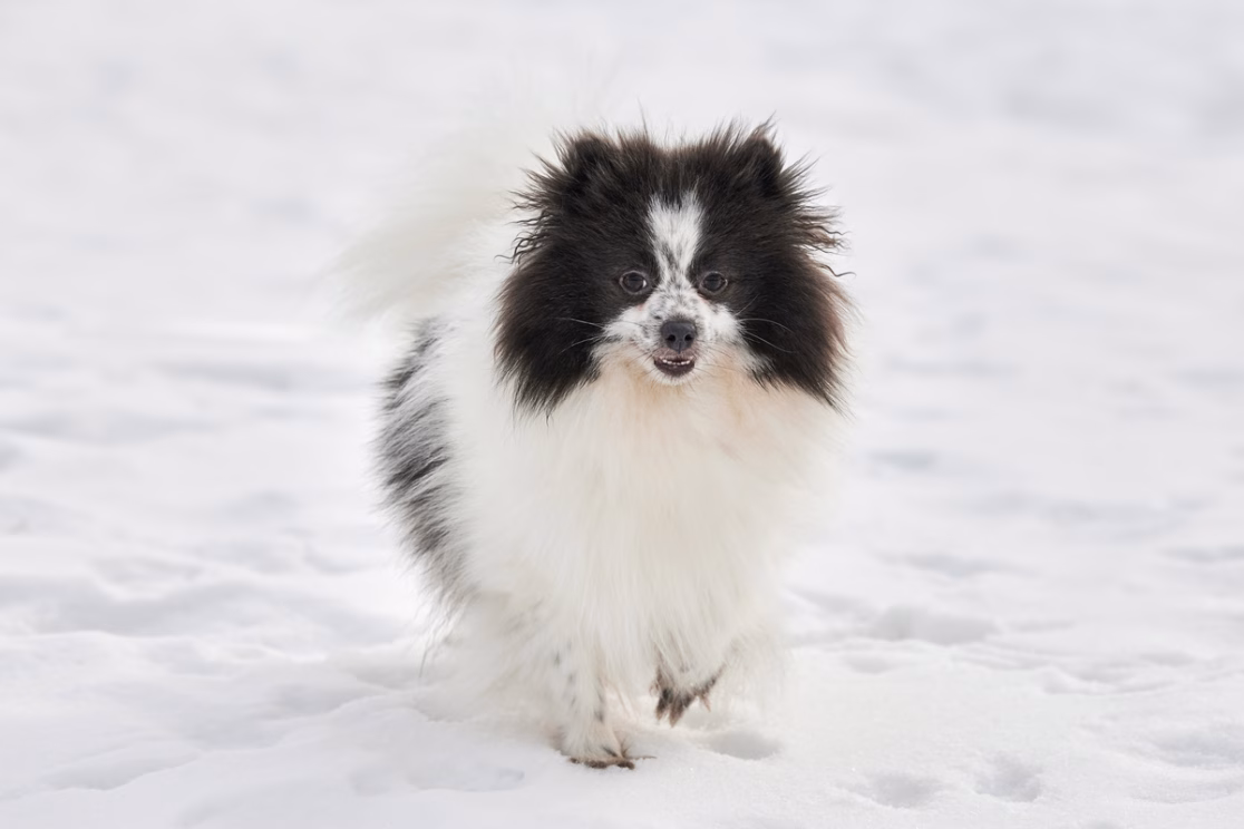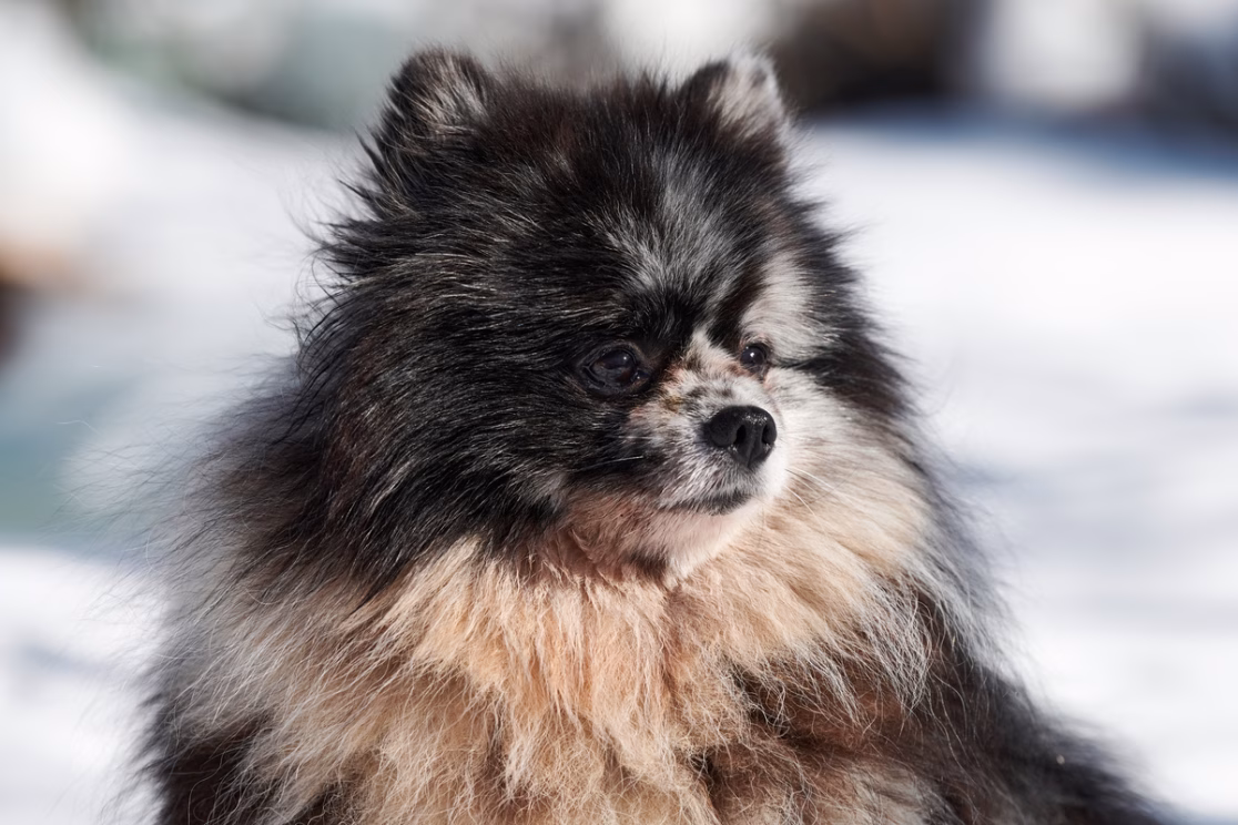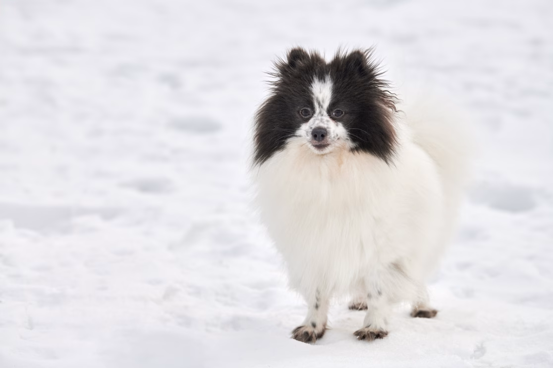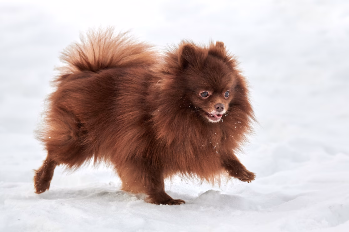 A winter walk with several adorable Pomeranian Spitz dogs on a sunny snowy day. Fluffy, energetic, and full of joy, these little dogs stand out against the bright white background of snow. A heartwarming outdoor moment.