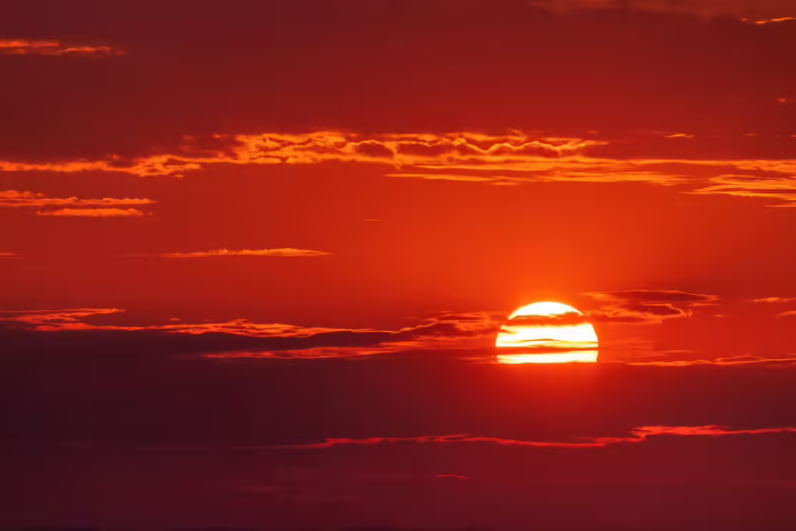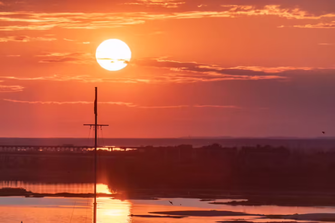 «A star called the Sun» sets over the edge of the earth creating fanciful outlines of the contours of the sky, forests and buildings.